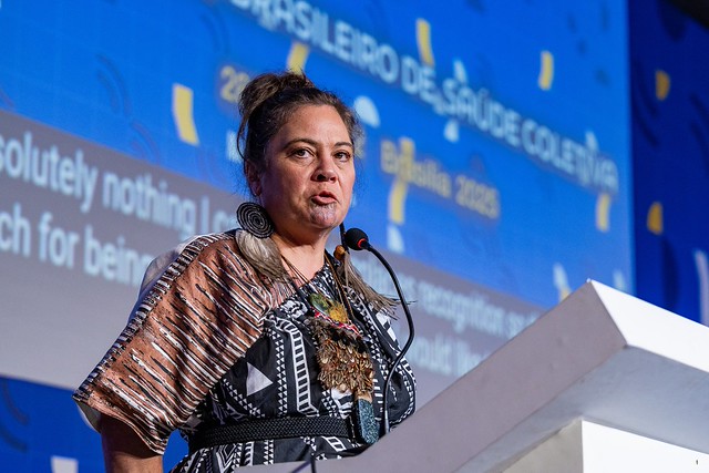 Ao projetar a imagem de uma obra de uma artista da Nova Zelândia, um rosto composto por faces diferenciadas, que revela a existência permanente de uma face oculta, Emma propôs um exercício de autorreflexão: quem ainda não estamos vendo? Quais vidas permanecem invisibilizadas nos processos decisórios? Para ela, as mudanças necessárias só ocorrerão quando houver um compromisso efetivo com a transformação das relações de poder. “Saúde pública é política. E isso aqui é política”, destacou, ao se referir ao espaço do congresso.